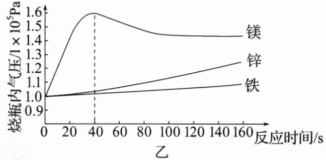 10. 兴趣小组同学探究金属和酸反应,进行实验:在烧瓶中分别加入等质量的镁粉、铁粉、锌粉和足量的等浓度的稀盐酸,塞紧瓶塞(如图甲所示),利用传感器记录 160 s 内烧瓶中气压变化,得到相关曲线如图乙所示。下列分析正确的是(