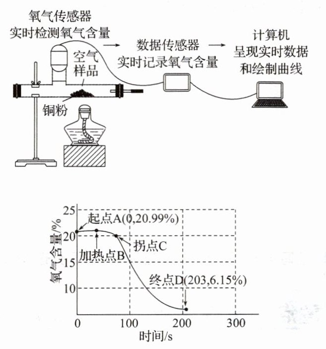 8. (2024·吉林中考)为探究铜的化学性质,某同学借助氧气传感器在密闭装置中进行如图所示实验,观察实验现象并分析氧气含量随时间变化的曲线图。其中终点 D(203, 6.15%)表示时间为 203 秒时,装置中氧气含量为 6.15%。结合图示判断下列说法错误的是(