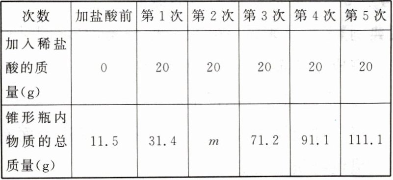(2)第一次减少的质量为$20g + 11.5g - 31.4g = 0.1g$,第三次减少的质量为$60g + 11.5g - 71.2g = 0.3g$,所以第二次减少的质量为$0.2g$,所以$40g + 11.5g - m = 0.2g$,$m = 51.3g$;