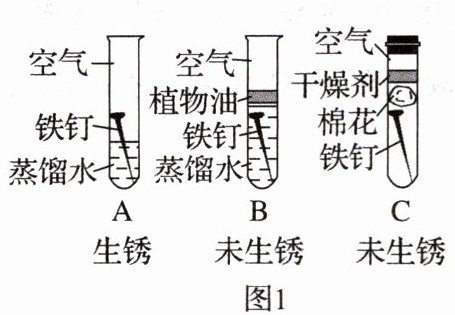 (1)图1实验中,对比A(与氧气接触,生锈)B(与氧气隔绝,未生锈)可知,铁生锈与氧气有关。