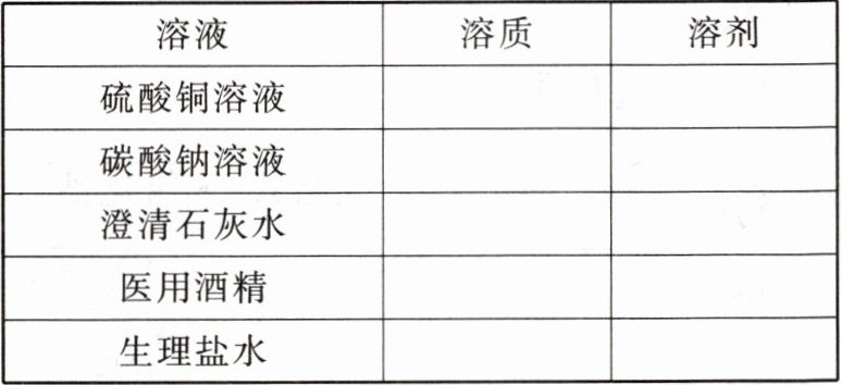 4. 在化学实验室里和日常生活中我们曾接触过许多溶液。指出下列溶液中的溶质和溶剂,完成下表。