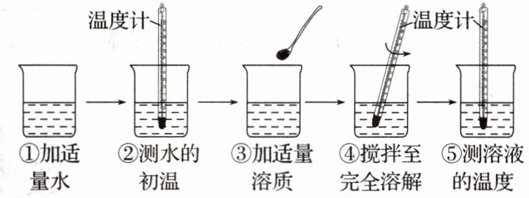 取三只烧杯,向烧杯中各注入 25 mL 水,测得水的初温为 20℃。再向三只烧杯中分别加入质量均为 8 g 的氢氧化钠、氯化钠和硝酸铵固体,搅拌,待溶解后用温度计分别测三只烧杯中溶液的温度。