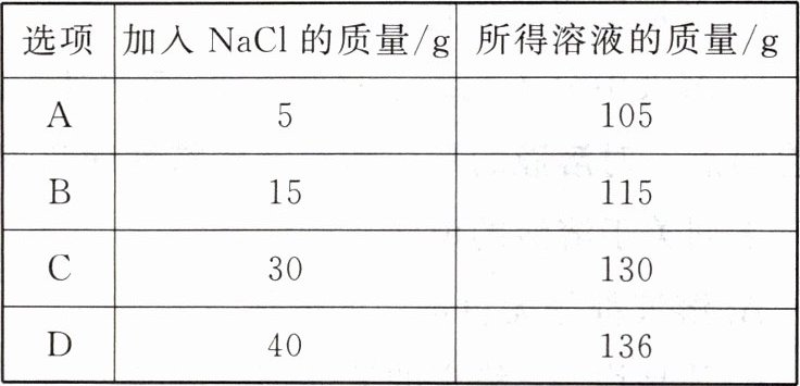 【典例】$20^{\circ}C$时,$100g$水中不断加入氯化钠固体($20^{\circ}C$时,$100g$水中最多溶解氯化钠的质量是$36g$),充分搅拌后过滤,称量所得溶液的质量如表所示,其中属于饱和溶液的是(