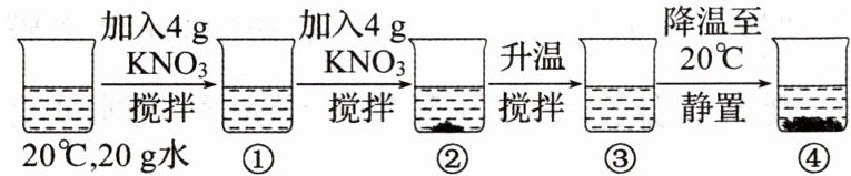 为探究硝酸钾的溶解性,进行了如图实验,其中溶液①、溶液③中没有剩余固体,溶液②、溶液④中有固体剩余,已知$20^{\circ}C$时,$100g$水中最多溶解硝酸钾的质量是$31.6g$,下列说法错误的是(
