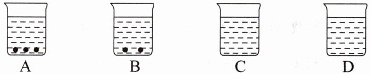 10. A、B、C、D 四个烧杯中分别盛有相等质量的水,在温度相同的条件下,向四个烧杯中分别加入$20g$、$15g$、$10g$、$5g$某物质,充分溶解后观察到如图所示的现象。请完成下列问题: