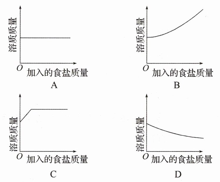 8. 在一定温度下,往一杯饱和食盐溶液中逐渐加入食盐,并不断搅拌。在此过程溶液中溶质质量与加入食盐质量的变化关系如图所示,其中正确的是(