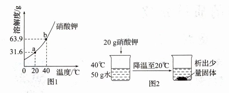 (1)A、没有指明温度,正确的说法是20℃时硝酸钾的溶解度是31.6g,错误;B、由溶解度曲线图可知,a、b两点均在硝酸钾的溶解度曲线上,则a点对应的溶液为20℃时硝酸钾的饱和溶液,b点对应的溶液为40℃时硝酸钾的饱和溶液,由于不明确a、b两点所对应的溶液质量,不能得出a、b两点所对应溶液中的溶质质量相差多少,错误;C、由溶解度曲线图可知,40℃时硝酸钾的溶解度是63.9g,图中在40℃时将20g硝酸钾加到50g水中能全部溶解,得到的溶液为硝酸钾的不饱和溶液,正确;