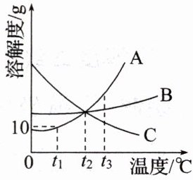B.t₃℃时,将等质量的 A、B、C 三种物质配成饱和溶液需要水最多的是 C