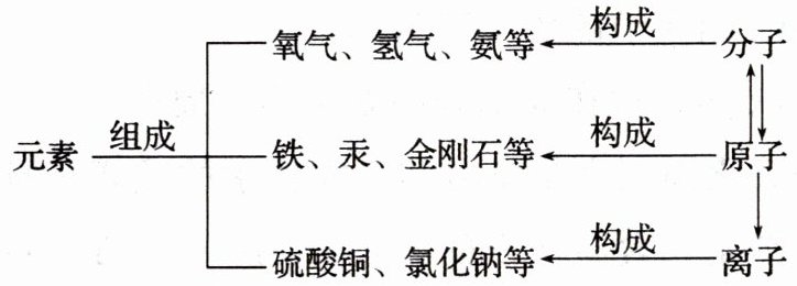 元素组成氧气、氢气、氨等,由分子构成;组成铁、汞、金刚石等,由原子构成;组成硫酸铜、氯化钠等,由离子构成。分子、原子、离子之间可以相互转化。