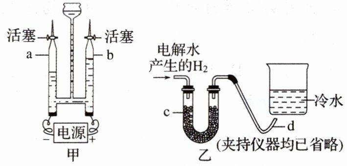 【设计实验】化学兴趣小组的同学设计了如图所示的实验来探究水的组成,其中图甲是电解水的实验装置,图乙中将电解水产生的氢气缓缓地通过装有足量无水硫酸铜(可吸收水分,干燥气体)的仪器 c,并在导管口 d 处将气体点燃,然后把盛有冷水的烧杯置于如图乙所示的位置。