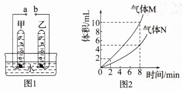 2. 图 1 是电解水的装置,图 2 是甲、乙试管中收集到的气体体积与时间的关系图。若甲试管中生成气体 N,下列说法不正确的是(