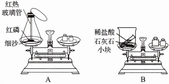 。(2)实验B中,反应前天平平衡,然后将稀盐酸倒入烧杯中与石灰石小块充分反应后再称量,观察到反应后天平不平衡,天平指针向