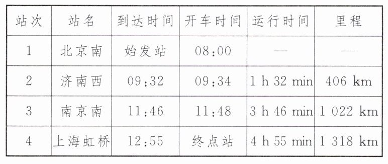 12. 小轩假期去上海姑姑家探亲,坐上北京南站到上海虹桥站的某次高速列车,看到了该列车的运行时刻表如表所示:
