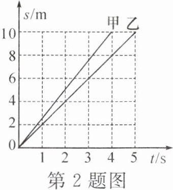 2. 在某校举办的机器人模拟救援比赛中,甲、乙两机器人同时从同一地点出发,沿直线匀速运动到 $10m$ 远的目的地,它们运动的路程随时间变化的图像如图所示。下列说法正确的是(
