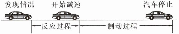 4. 汽车遇到意外情况时紧急停车要经历反应和制动两个过程,汽车在反应过程中做匀速直线运动,在制动过程中做变速直线运动,如图所示。若汽车以 72 km/h 的速度在平直的公路上行驶,紧急停车时,在反应过程中,汽车行驶了 14 m,制动过程所用的时间为 2.3 s,汽车在制动过程中通过的路程为 16 m。