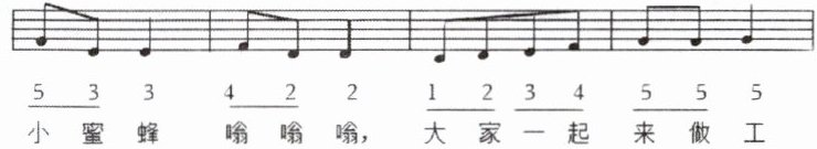 3. 如图所示是童谣《小蜜蜂》的歌词与乐谱,在小红唱到“大家一起”这四个字时,音调逐渐升高,由此可得到(