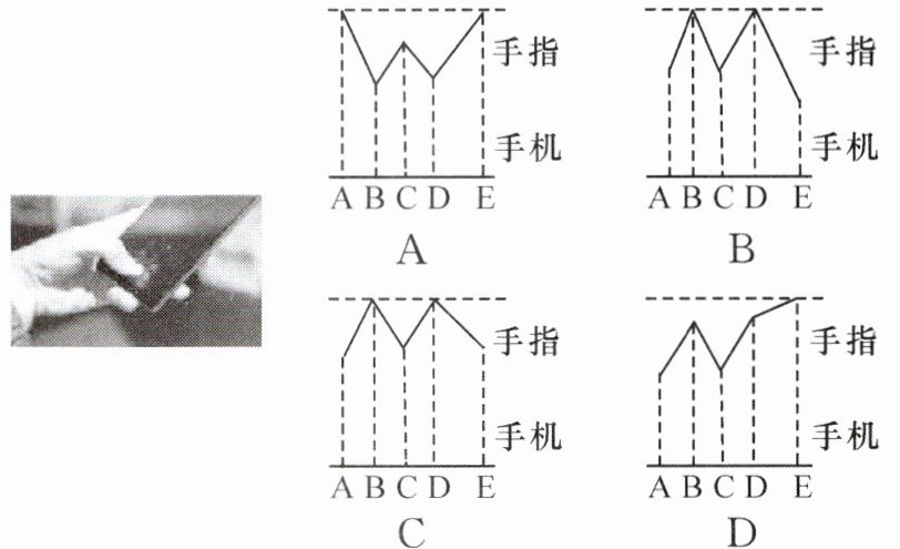 7. 如图,某手机内置有超声波识别系统,手机发出的超声波遇到手指上凸凹不平的指纹A、B、C、D、E五个位置,测得回收信号的时间分别为0.27ms、0.41ms、0.27ms、0.41ms、0.19ms,可求出手指与手机平面的距离,则该处指纹的大致形状是(