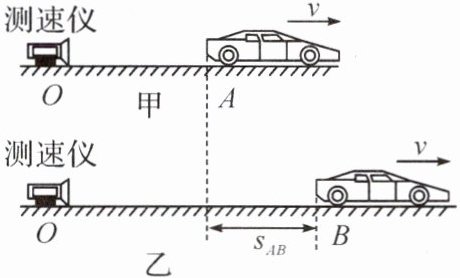 1. 为了监测超速行驶的违法行为,公路上常常设置有超声波测速仪,如图为某公路直线路段的一处测速仪,测速仪能发射和接收超声波。当行驶的小车距离测速仪 $ s_{OA}=62m $ 时(如图甲),测速仪向小车发出超声波,超声波“追上”小车时,小车刚好运动到 $ B $ 点(如图乙)。测速仪从发出超声波到接收反射回来的超声波所用的时间为 $ 0.4s $。超声波的速度为 $ 340m/s $。求: