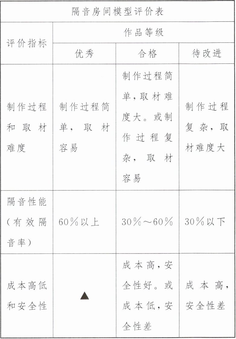1. 对制作好的隔音房间模型,要从多个方面综合去评价考虑,请将下表中“▲”处补充完整: