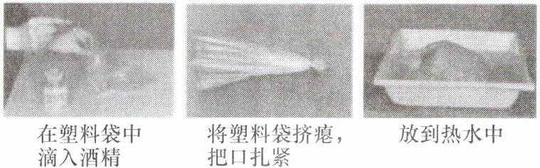 1. 如图所示,在透明塑料袋中滴入几滴酒精,将塑料袋挤瘪,排尽空气后用绳把口扎紧,然后放入热水中,会看到塑料袋鼓起来,是由于袋内液体酒精变成