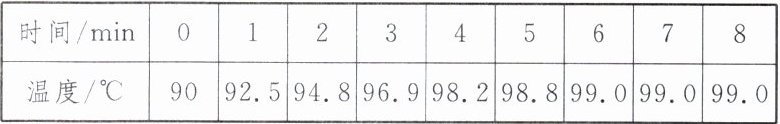(1)按照图甲规范组装器材,用酒精灯给烧杯中的水加热,从水温达到$90.0^{\circ}C$开始每隔$1\min$记录一次水温,直到水沸腾一段时间后停止加热。数据记录如下表: