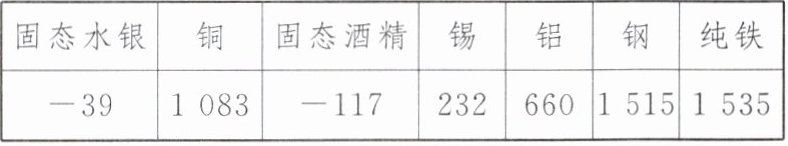 (填“能”或“不能”)选用铁锅熔化锡块。在气温为-50℃的地方,酒精