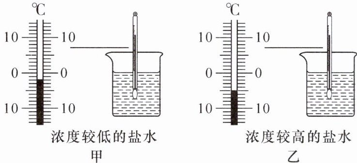 2. (2023·长沙)环卫工人往结冰的桥面撒盐加快冰的熔化,激发了小明探究盐水凝固点的兴趣。他把两杯浓度不同的盐水放入冰箱冷冻室里,当杯内的盐水中出现冰块时测量它们的温度,温度计的示数如图所示,图乙中温度计的示数为