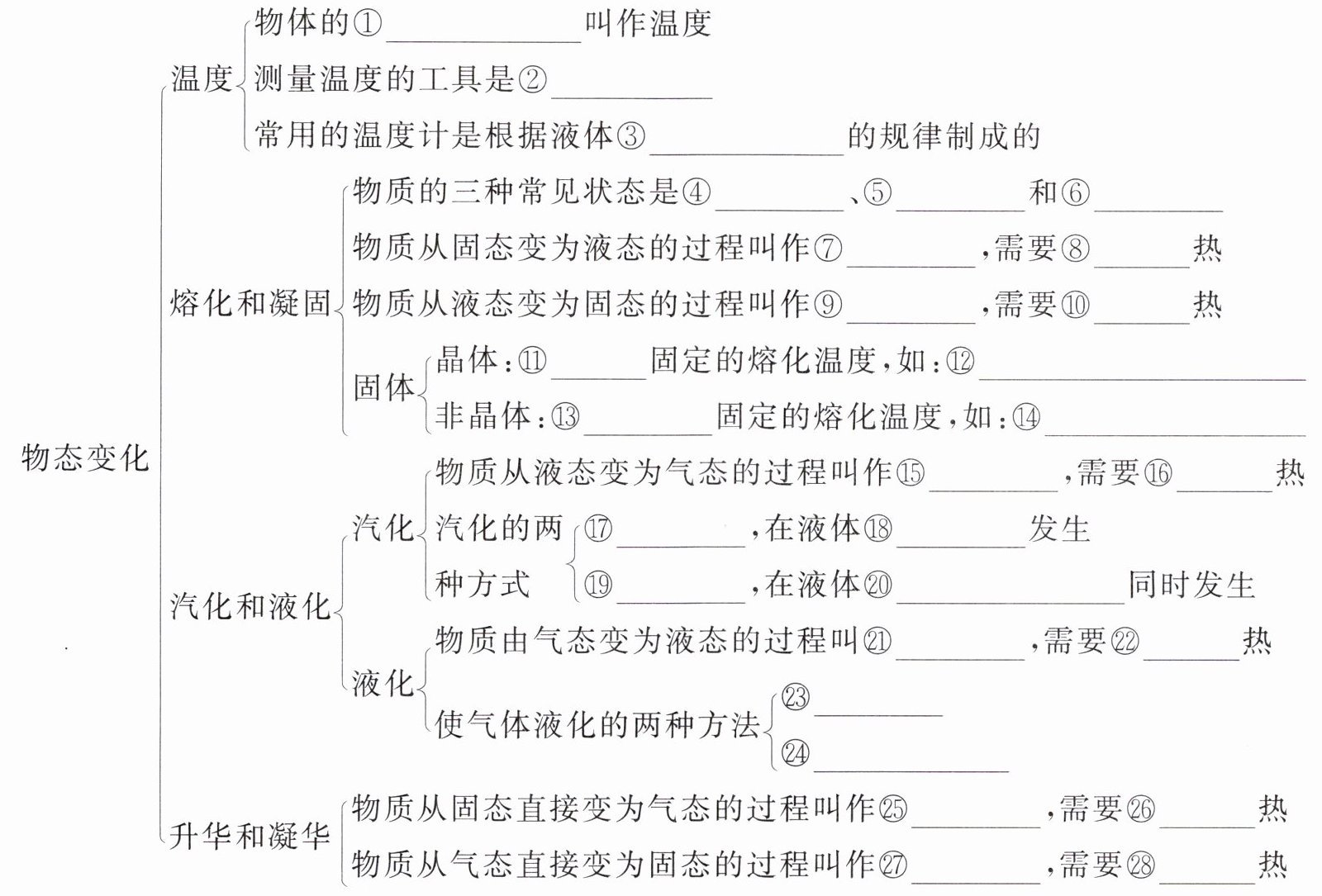 ①冷热程度 ②温度计 ③热胀冷缩 ④固态 ⑤液态 ⑥气态 ⑦熔化 ⑧吸 ⑨凝固 ⑩放 ⑪有 ⑫冰、海波、各种金属 ⑬没有 ⑭蜡、松香、玻璃 ⑮汽化 ⑯吸 ⑰蒸发 ⑱表面 ⑲沸腾 ⑳表面和内部 ㉑液化 ㉒放 ㉓降温 ㉔压缩体积 ㉕升华 ㉖吸 ㉗凝华 ㉘放
