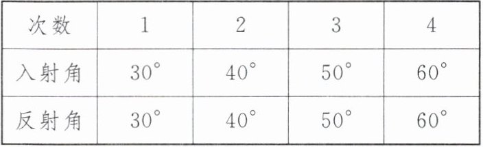 (填“靠近”或“远离”)平面镜。进行实验后的测量数据如下表,由此可得:在反射现象中,反射角等于入射角