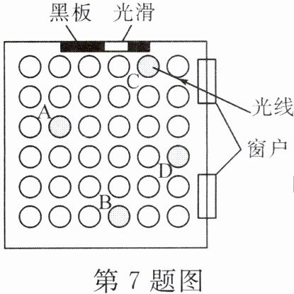 7. 教室黑板用久后有一部分变得光滑,容易发生镜面反射。如图所示,当太阳光从右侧窗户射入时,最有可能因反光看不清光滑处文字的同学是(