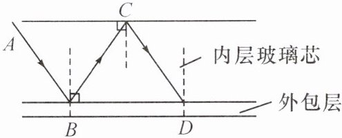 10. 光在玻璃纤维中的传输情况是光线每次由内层玻璃芯射向与外包层的分界面时,均要发生反射,光在不断地反射中沿内层玻璃芯向远处传播。如图所示,当增大入射光线 AB 的入射角时,CD 光线的入射角将