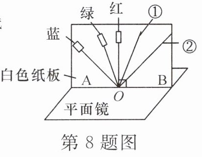 8. (多选)如图所示,小海同学在“探究光的反射定律”实验中,利用红、绿、蓝三种色光的激光笔进行实验,他将位于同一平面内的白色纸板立在平面镜上。下列说法中不正确的是(