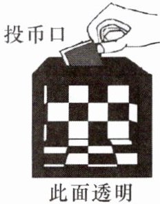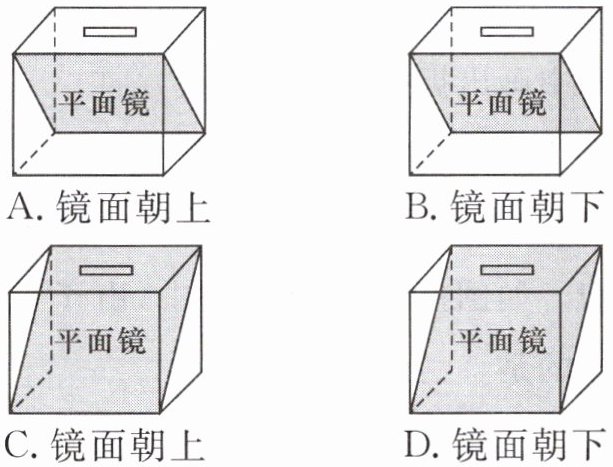 9. 小明在科技节中表演魔术:从投币口投入只有正面透明的棋盘格空箱的硬币消失了!随后他揭秘:这是平面镜和棋盘格共同形成的结果。下列放置平面镜的方式能实现这个魔术效果的是(