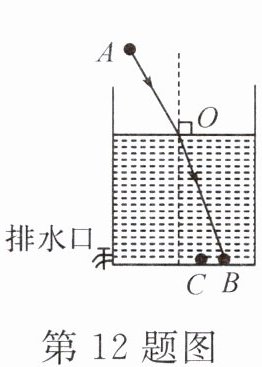 12. 如图,一束光从 $ A $ 点射向水面上的 $ O $ 点,照射到容器底部的 $ B $ 点,如果要让折射光线射到 $ C $ 点,应保持入射点不变,
