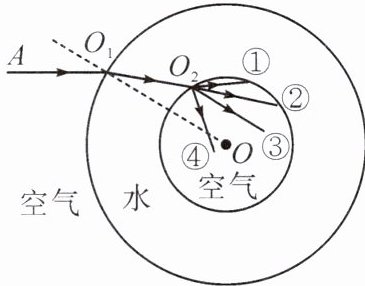 15. 在天宫课堂中,航天员王亚平将空气注入水球,形成的气泡球与水球的球心都在 $ O $ 点。一束光从空气射入水球的光路如图所示,其中球心 $ O $ 与入射点 $ O_1 $ 的连线为法线。则进入气泡球的折射光线可能为(