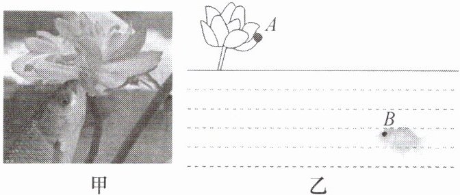 15. 古都开封风景宜人,每逢夏季荷花盛开更是吸引了不少游客;如图甲是一名摄影爱好者拍摄到的鱼儿咬食荷花的场景,请在图乙中画出鱼未出水面时看到荷花的大致光路图,A 表示荷花、B 表示鱼眼。