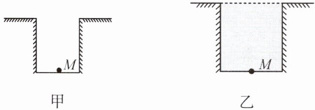 (2)一场大雨后,井中灌满积水,青蛙仍在井底 M 点“坐井观天”,请在图乙中大致画出青蛙通过积水能观察到的井外的范围。