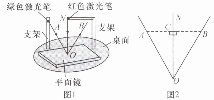 2. 为验证光的反射定律,小刚准备了两支不同色光的激光笔、平面镜和固定激光笔的支架,组装为如图1所示实验装置,将该装置放在水平桌面上。打开激光笔后,绿光斜射到平面镜上的O点,红光垂直照射到O点。请回答下列问题: