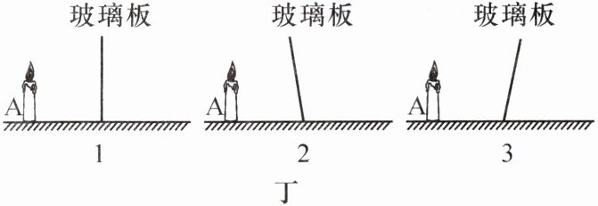 (5) 另一个实验小组的小宾点燃蜡烛 A 后,观察发现:玻璃板中蜡烛 A 的像偏低且倾斜。你认为在图丁所示的 1、2、3 三幅图中,