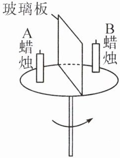 2. 在校园科技节活动中,小明观看了“隔着玻璃吹蜡烛”的魔术。表演者介绍图中的道具后旋转平台,使玻璃板一侧正对观众,分两步完成了表演:①用两个打火机同时“点燃”两支蜡烛;②在玻璃板正对观众的一侧吹 A 蜡烛。观众看到两支蜡烛同时被“吹灭”。小明利用道具,和同学们一起探究其中的奥秘。