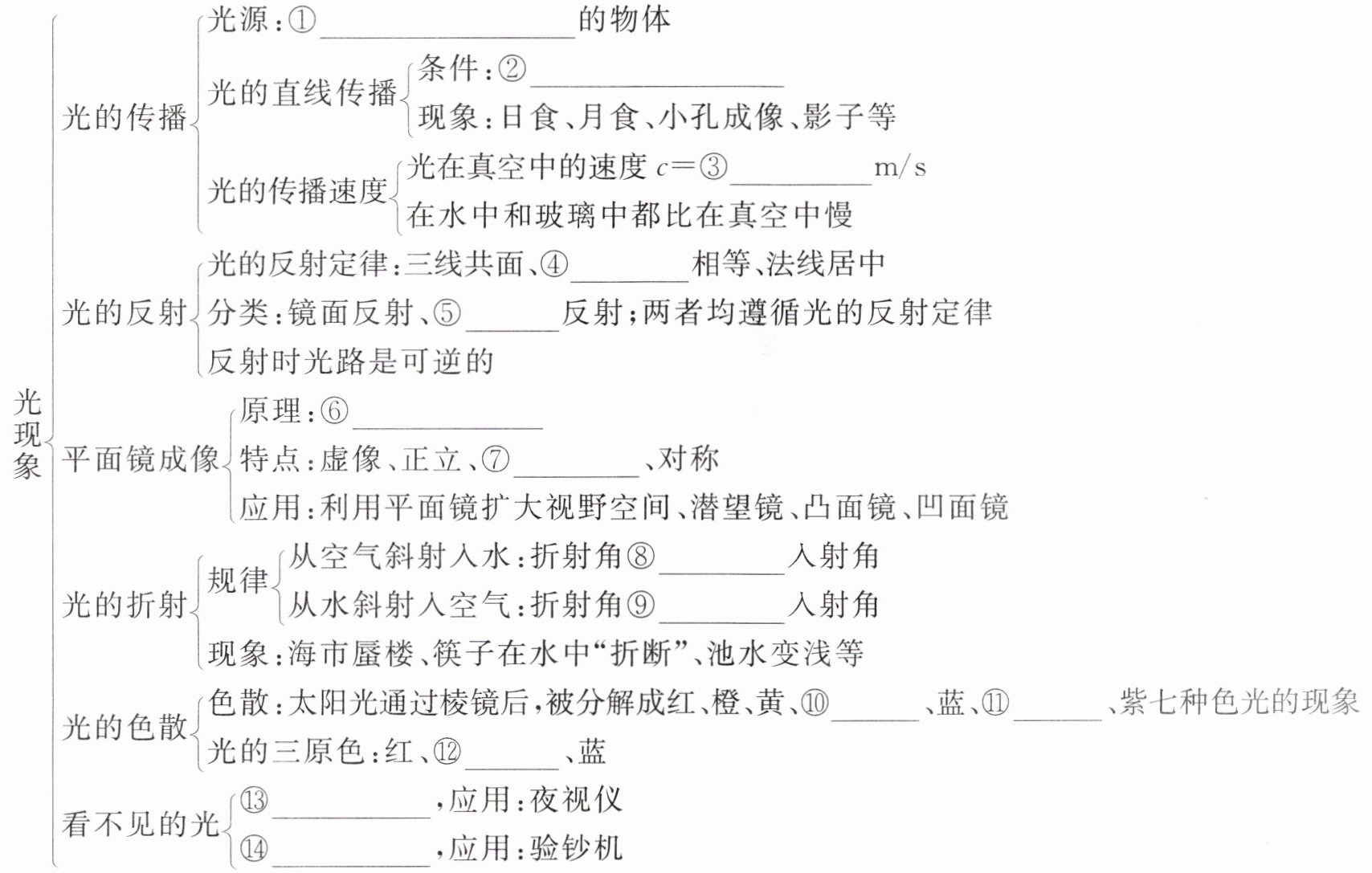 ①自身能够发光 ②同种均匀介质 ③$3× 10^{8}$ ④两角 ⑤漫 ⑥光的反射 ⑦等大 ⑧小于 ⑨大于 ⑩绿 ⑪靛 ⑫绿 ⑬红外线 ⑭紫外线