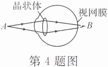 4. 如图所示,来自物体上A点的光经过眼睛的晶状体成像在视网膜后面的B点,要使成在B点的像靠近视网膜,物体应该向