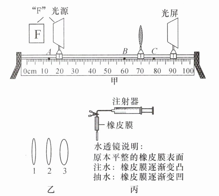 (填“A”“B”或“C”)点,缓慢调节水透镜中的水量,当水透镜形成焦距合适的凸