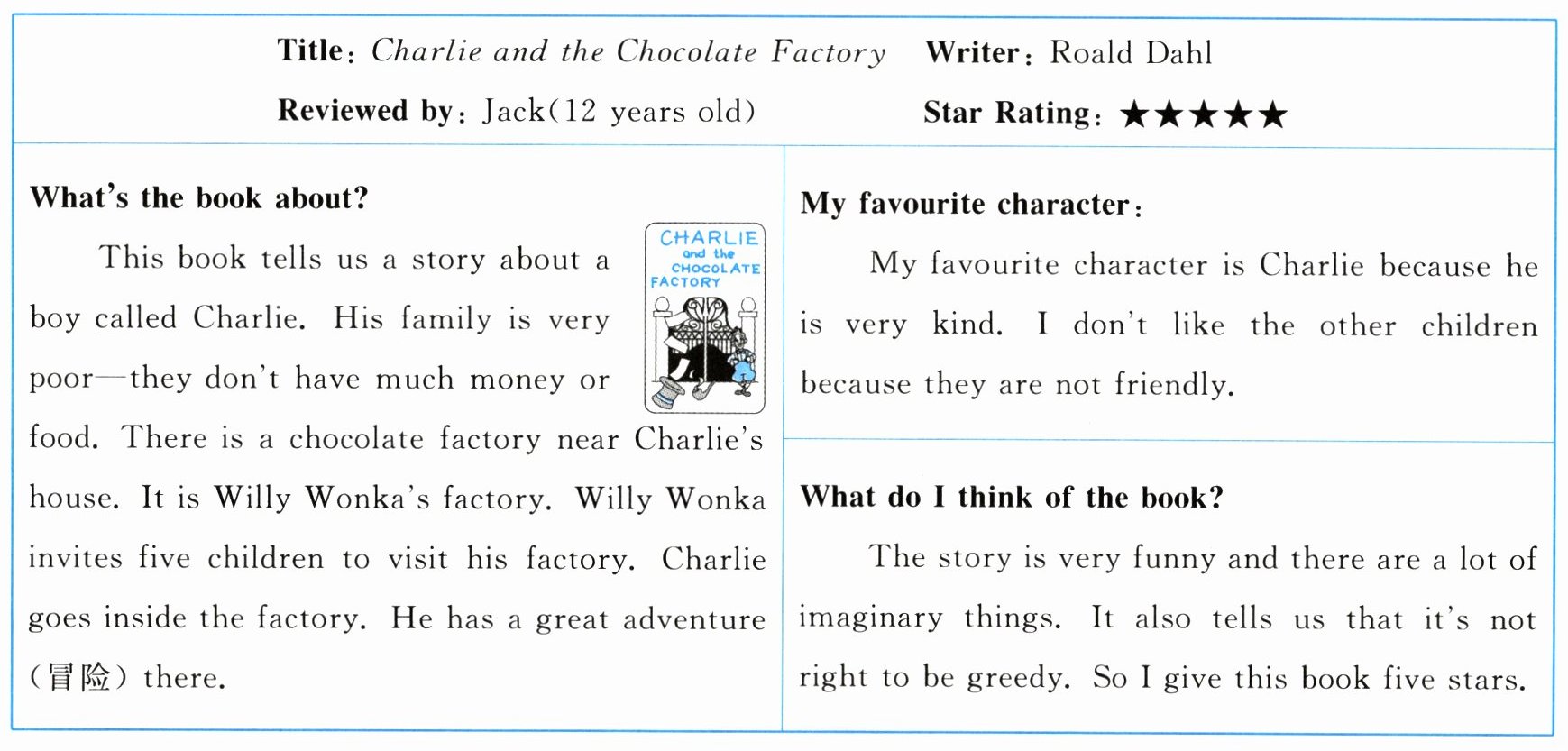)1. Who writes this book review? A. Roald Dahl. B. Jack. C. Charlie.(