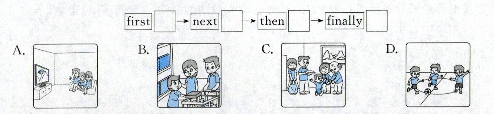 三 听两遍录音,根据所听内容描述的顺序,将下列图片的序号填入相应的方框内。(4分)