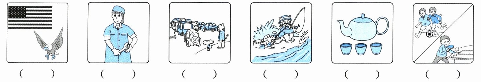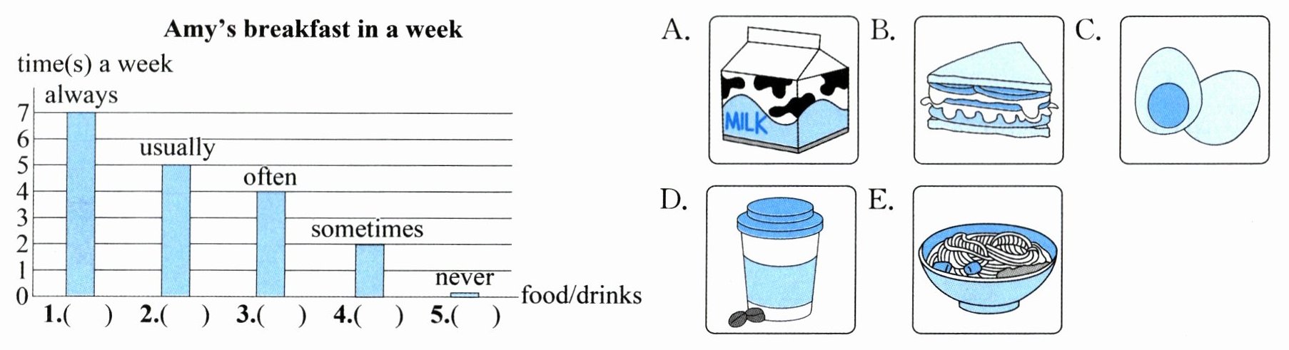 四 (2025·南通海安市期末)听两遍录音,根据所听内容,将食物图片的序号填入对应的括号内,完成Amy一周早餐的柱状图。(5分)