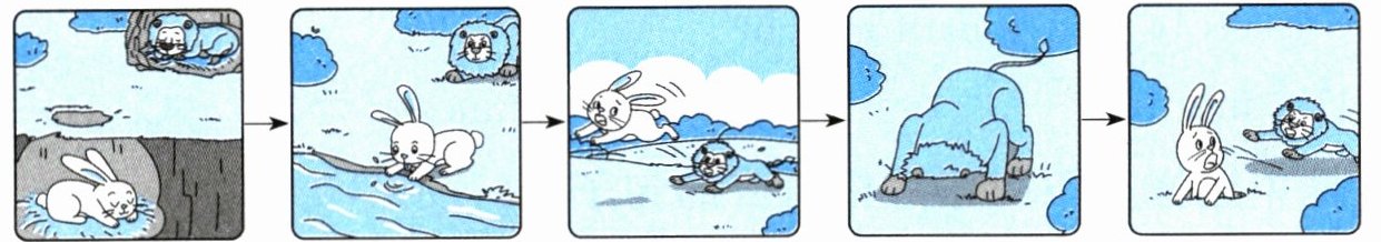 )The lion can't get into the hole. He says to the rabbit, "I don't like eating rabbits. I want to play with you."(