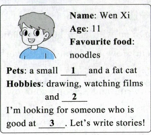 )3. A. They like climbing. B. She likes taking photos. C. He likes playing football.(