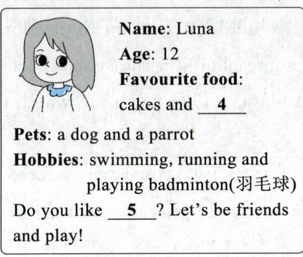 )4. A. No. I like blue. B. Yes. I'm good at it. C. No. I like piano lessons.(