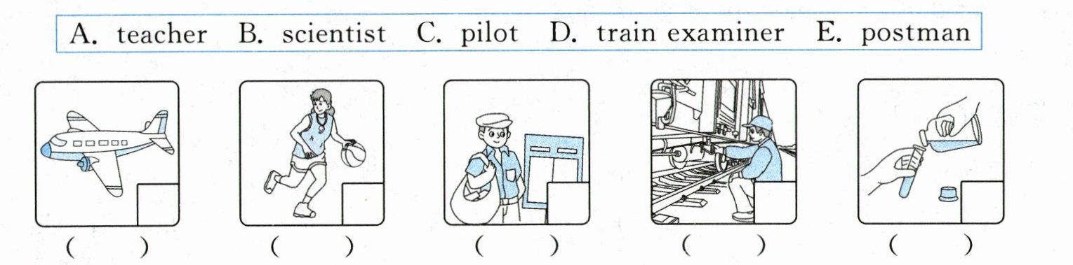 四 根据短文提示,按短文描述顺序给下列图片排序,将数字序号填入相应的括号内,并从方框中选择与图片相匹配的职业,将英文序号填入图片中的方框内。(5 分)